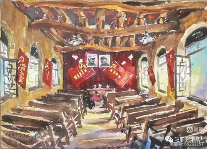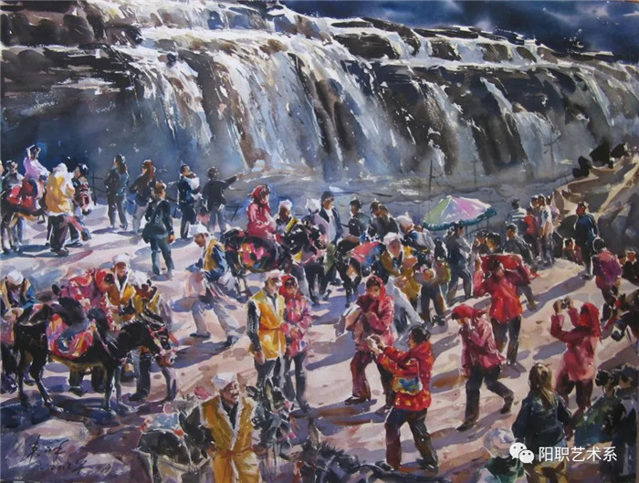 宮老師的水彩畫創作是在勤于學習、思考中不斷完善,實踐創新,他學過美國本土畫家安德魯·懷斯的細膩技法,學過英國畫家約翰·亞德利的寫意風格,學過美國水彩大師薩金特的瀟灑精神,最后還是回到中國畫傳統的寫意精神上來。他五十多歲后創作的題材有了很大變化,從原來的鄉土小情調變成了社會大主題及革命歷史主題上來了,他的寫意精神也隨之越發體現出來。比如他畫的《黃河大集》《沸騰的小山村》《刀馬旦》等作品用筆干凈老辣、氣勢磅礴、生機盎然、有度有勢,游于象外的超曠空靈、畫面的勃勃生機,盡顯中國式寫意水彩畫的獨特魅力。