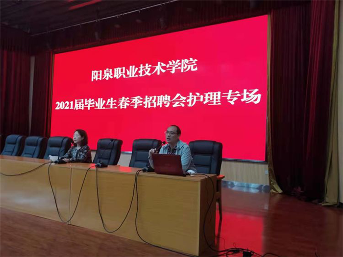 參會的用人企業有陽泉市城區醫養康復醫院、陽泉市緊急醫療救援中心、陽泉河下中西醫結合醫院、陽泉康貝齒科醫院、天津市東麗區田立禾養老中心、北京海圣祥醫療集團、昆山宗仁卿紀念醫院、北京五指生亞健康保健技術研發中心、北京勁松口腔醫院、中信國安青島醫療公司、樂清開發區同樂醫院有限公司、陽泉市城區晉東醫院、山東青島黃島靈山灣醫院、天津河東東興醫院、北京京煤集團總院大臺醫院、致眸山西生物科技有限公司、北京崇文中方中醫醫院、青島黃海制藥責任有限公司、陽泉新華醫院、廣州市艾生維醫藥科技有限公司、陽泉市靜安醫院、陽泉康雅口腔醫院、北京九華山莊醫院、陽泉博愛醫院、陽泉晶賽生物科技有限公司等26家醫療機構,共計提供388個護理、藥學專業的崗位,醫護系130余名2021屆畢業生參加了招聘會。